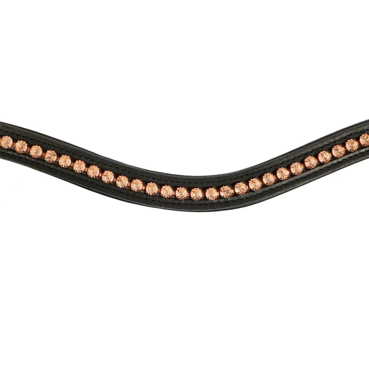 Der geschwungene Stirnriemen aus braunem Qualitätsleder ist mit roséfarbenen Kristall-Strass-Steinen besetzt.