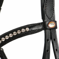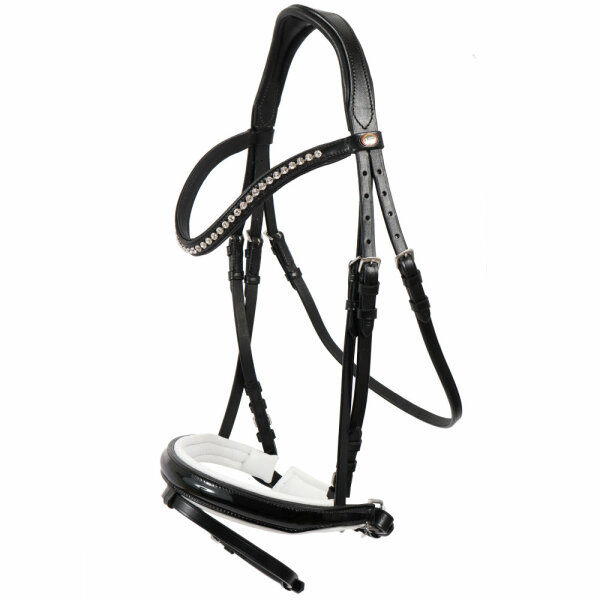 Die Trense Hagen setzt Highlights. Das schwedische Lack-Reithalfter ist ein echter Hingucker. Passend dazu die auffälligen Kristall-Strass-Steinen auf dem modern geschwungenen Stirnband. Der weiß unterlegte Nasenriemen ist, wie auch das Genickstück extrem weich gepolstert. Diese Pferde Trense ist für jede Disziplin vielseitig einsetzbar.