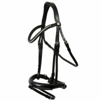 Die Trense Wiesbaden in den Farben Schwarz/Silber hat einen geschwungenen Stirnriemen mit Kristall-Strass-Steinen in Diamantfarben. Das breite, schwarz unterlegte englische Reithalfter ist mit seitlichen Ausformungen aufwendig gearbeitet und weich gepolstert. Ein Zaumhaken unterstreicht die schlichte Eleganz dieser Trense.