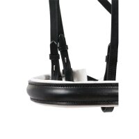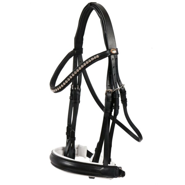 The Hamburg double bridle captivates with its sparkling crystal rhinestones on the browband. The refined noseband with black matt leather has a white lining. The double bridle is available with a Swedish noseband. The double bridles were designed for dressage. In order to ride the horses properly with the double bridle, riders need a sensitive hand. To ensure that the horse's well-being is always the top priority, Hans Melzer Horse Equipment has designed the double bridles with soft padding and a cut-out noseband. The double bridles differ in appearance. Some are available in an elegant patent finish, while others are more simple in design. The padding colours are black, white or brown. All products are available with bridle hooks. The double bridles are available in pony, cob, full and XFull sizes. They include smooth leather reins and reins with bars. Horse-friendly, versatile and reliable – that's Hans Melzer Horse Equipment. True to the motto: brand quality at affordable prices. Since 2010, the two riders Anne and Hans Melzer have been expanding their collection. What began with a few bridles has now developed into a broad portfolio. In addition to bridles, Hans Melzer Horse Equipment offers double bridles, breastplates and halters, among other things. The range also includes various individual items such as browbands, reins, auxiliary reins and stirrup leathers. New products are developed every year to optimise the range. The welfare of the horses is the top priority. For this reason, strict quality controls and extensive tests are carried out on every new collection.