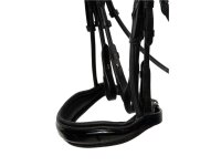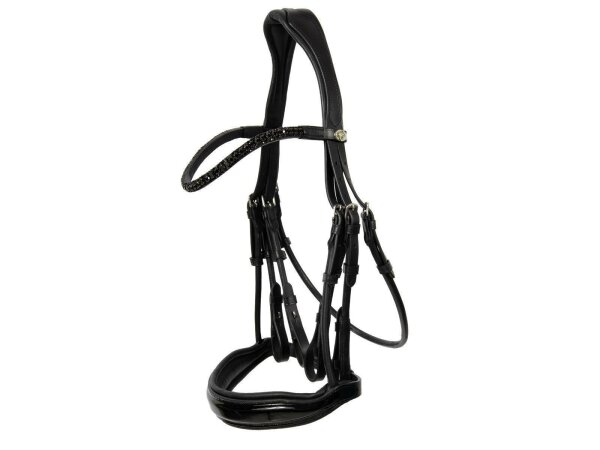 The Aachen double bridle from Hans Melzer Horse Equipment is a masterpiece of equestrian equipment that impresses with its quality and elegance. The round-stitched design ensures precise guidance and control of your horse, while the premium headpiece maximises comfort. The combination of black leather and shiny lacquer gives the double bridle an elegant look, which is stylishly complemented by silver accents. The English noseband is equipped with a practical bridle hook that allows for quick and easy adjustment. This double bridle is not only a functional tool, but also a stylish accessory for discerning riders who value quality and design.