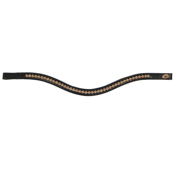 Der geschwungene Stirnriemen aus schwarzem Qualitätsleder ist mit kleinen honigfarbenen Kristall-Strass-Steinen besetzt.