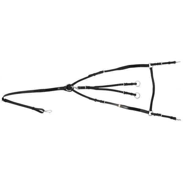 Das Vorderzeug Bad Harzburg in den Farben Schwarz/Silber ist mit elastischen Einsätzen an beiden Seiten und abnehmbarer Martingabel ausgestattet. Die Produkte gibt es in den Größen Pony und Cob/Full.Vorderzeuge von Hans Melzer Horse Equipment besitzen einen simplen wie genialen Look. Mehr jedoch also das Aussehen verhindern sie, dass der Sattel auf dem Pferderücken verrutscht. Dies dient der Sicherheit des Reiters und dem Wohlbefinden des Pferdes. Welchem Pferd gefällt es denn, wenn der Sattel verrutscht und deswegen zu drücken beginnt?Pferdefreundlich, vielseitig und zuverlässig sind die Produkte von Hans Melzer Horse Equipment. Ganz nach dem Motto: Markenqualität zu günstigen Preisen. Seit 2010 bauen die beiden Reiter Anne und Hans Melzer ihre Kollektion weiter aus. Was mit ein paar Trensen begann, hat sich inzwischen zu einem breiten Portfolio entwickelt. Unter anderem werden, zuzüglich der Trensen, von Hans Melzer Horse Equipment Kandaren, Vorderzeuge und Halfter angeboten. Des Weiteren findet man diverse Einzelteile, wie Stirnriemen, Zügel, Hilfszügel und Steigbügelriemen im Sortiment. Jedes Jahr werden neue Produkte entwickelt um das Angebot zu optimieren. Dabei steht das Wohl der Pferde an oberster Stelle. Aus diesem Grund wird bei jeder neuen Kollektion strenge Qualitätskontrollen und umfangreiche Tests durchgeführt.