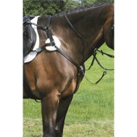 Das Vorderzeug Marbach in den Größen Cob, Full und XFull hat eine 5-Punkt-Befestigung mit Gummizug. Das Material ist aus schwarzem Qualitätsleder und silberfarbenen Schnallen. Zum Wohle des Pferdes befindet sich an diesem Vorderzeug eine Lammfellpolsterung.Vorderzeuge von Hans Melzer Horse Equipment besitzen einen simplen wie genialen Look. Mehr jedoch also das Aussehen verhindern sie, dass der Sattel auf dem Pferderücken verrutscht. Dies dient der Sicherheit des Reiters und dem Wohlbefinden des Pferdes. Welchem Pferd gefällt es denn, wenn der Sattel verrutscht und deswegen zu drücken beginnt?Pferdefreundlich, vielseitig und zuverlässig sind die Produkte von Hans Melzer Horse Equipment. Ganz nach dem Motto: Markenqualität zu günstigen Preisen. Seit 2010 bauen die beiden Reiter Anne und Hans Melzer ihre Kollektion weiter aus. Was mit ein paar Trensen begann, hat sich inzwischen zu einem breiten Portfolio entwickelt. Unter anderem werden, zuzüglich der Trensen, von Hans Melzer Horse Equipment Kandaren, Vorderzeuge und Halfter angeboten. Des Weiteren findet man diverse Einzelteile, wie Stirnriemen, Zügel, Hilfszügel und Steigbügelriemen im Sortiment. Jedes Jahr werden neue Produkte entwickelt um das Angebot zu optimieren. Dabei steht das Wohl der Pferde an oberster Stelle. Aus diesem Grund wird bei jeder neuen Kollektion strenge Qualitätskontrollen und umfangreiche Tests durchgeführt.